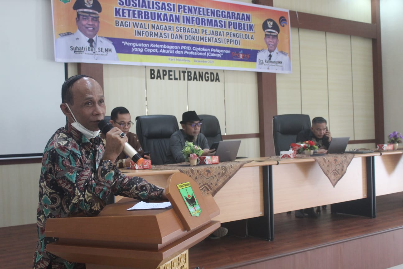 Padang Pariaman, beritasumbar.com – Pemerintah Kabupaten Padang Pariaman menggelar sosialisasi penyelenggaraan Keterbukaan Informasi Publik (KIP) untuk Pejabat Pengelola Informasi dan Dokumentasi (PPID). Kegiatan itu diprakarsai oleh Dinas Komunikasi dan Informatika (Kominfo) setempat dilaksanakan di Aula Bappelitbangda Kawasan Ibu Kota Kabupaten (IKK) di Nagari Parik Malintang Kecamatan Anam Lingkuang, Kamis (16/12).