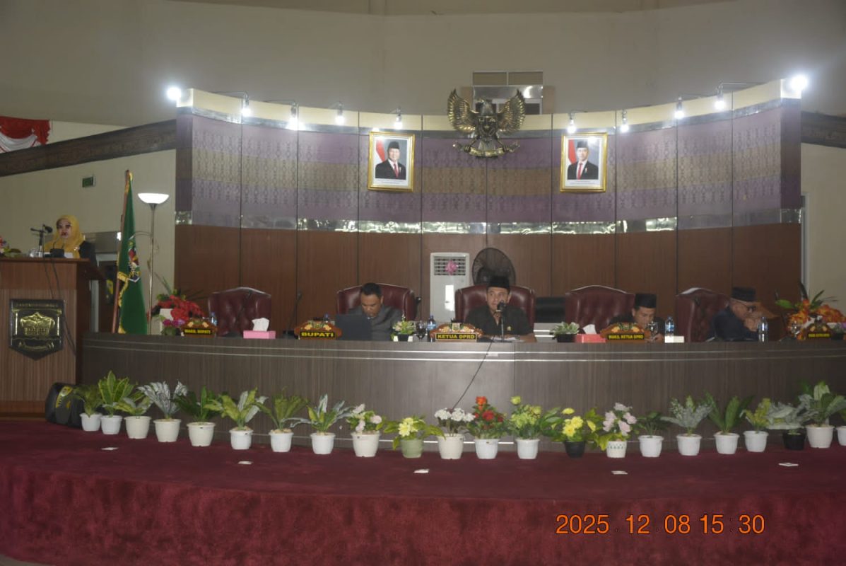 Pada kesempatan tersebut, Bupati Beny Dwiva Yuswir menyampaikan duka cita terhadap musibah yang melanda sumbar, sumut, dan aceh. Ditengah efisiensi anggaran. Tahun 2026, diupayakan untuk melakukan berbagai kegiatan agar PAD meningkat. Sekwan Miswita menyampaikan Ranperda yang telah diselesaikan tahun 2025 , dan akan dilaksanakan 2026