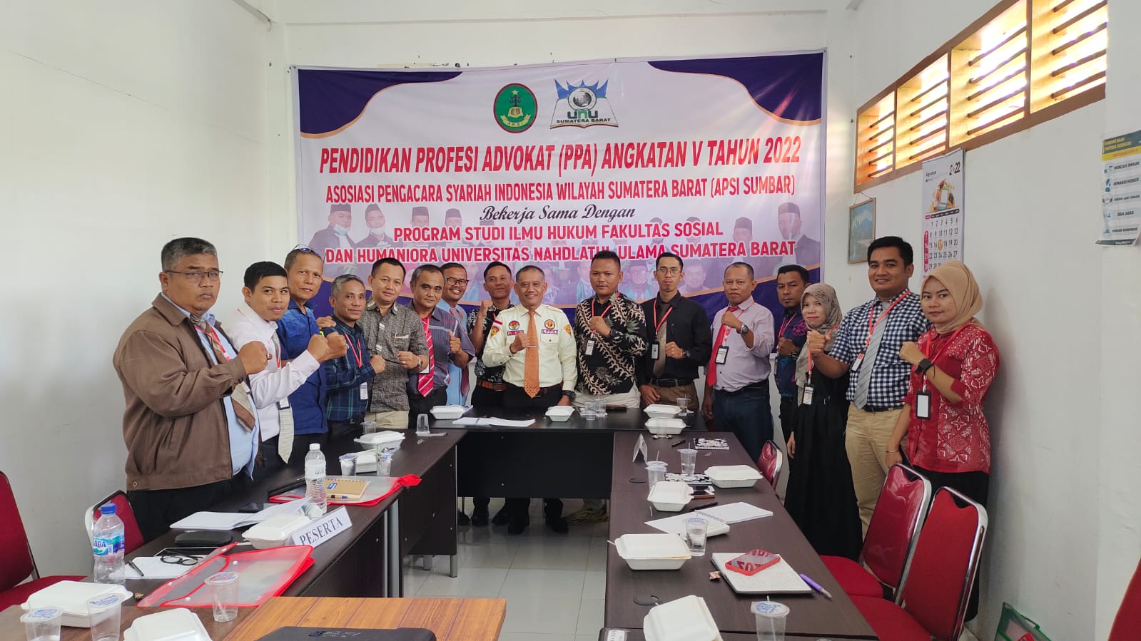 Acara Pendidikan Khusus Profesi Advokat (PKPA) Asosiasi Pengacara Syariah Indonesia (APSI) Sumbar ini juga bekerja sama dengan Program Studi Ilmu Hukum Fakultas Sosial dan Humaniora Universitas Nahdlatul Ulama (UNU) Sumbar serta diadakan sebagai salah satu syarat untuk menjadi advokat dan sebagai bekal bagi calon advokat tersebut dalam menjalankan profesinya sebagai advokat nantinya. (Andra)