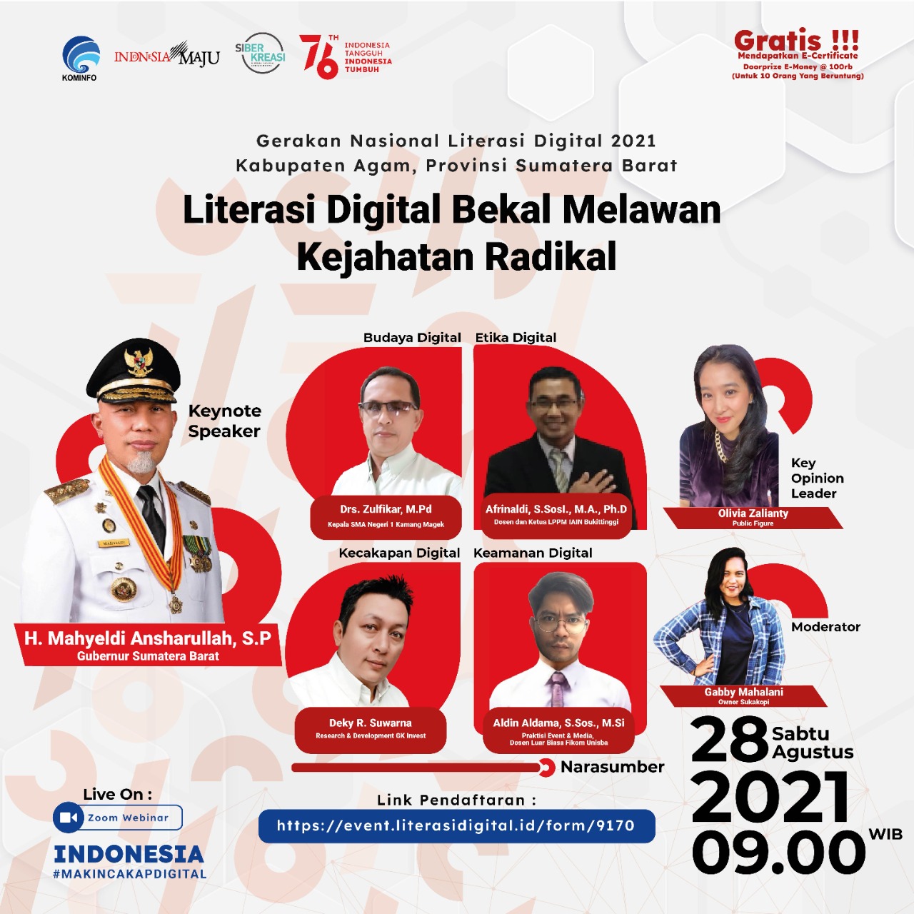 Agam,BeritaSumbar.com, — Sebuah webinar membahas tentang bekal melawan kejahatan dan perundungan siber menghadirkan aktris papan atas tanah air, Olivia Zalianty. Pemain film drama series Ada Apa Dengan Cinta itu hadir secara virtual di Kabupaten Agam, Sabtu (28/8/2021).