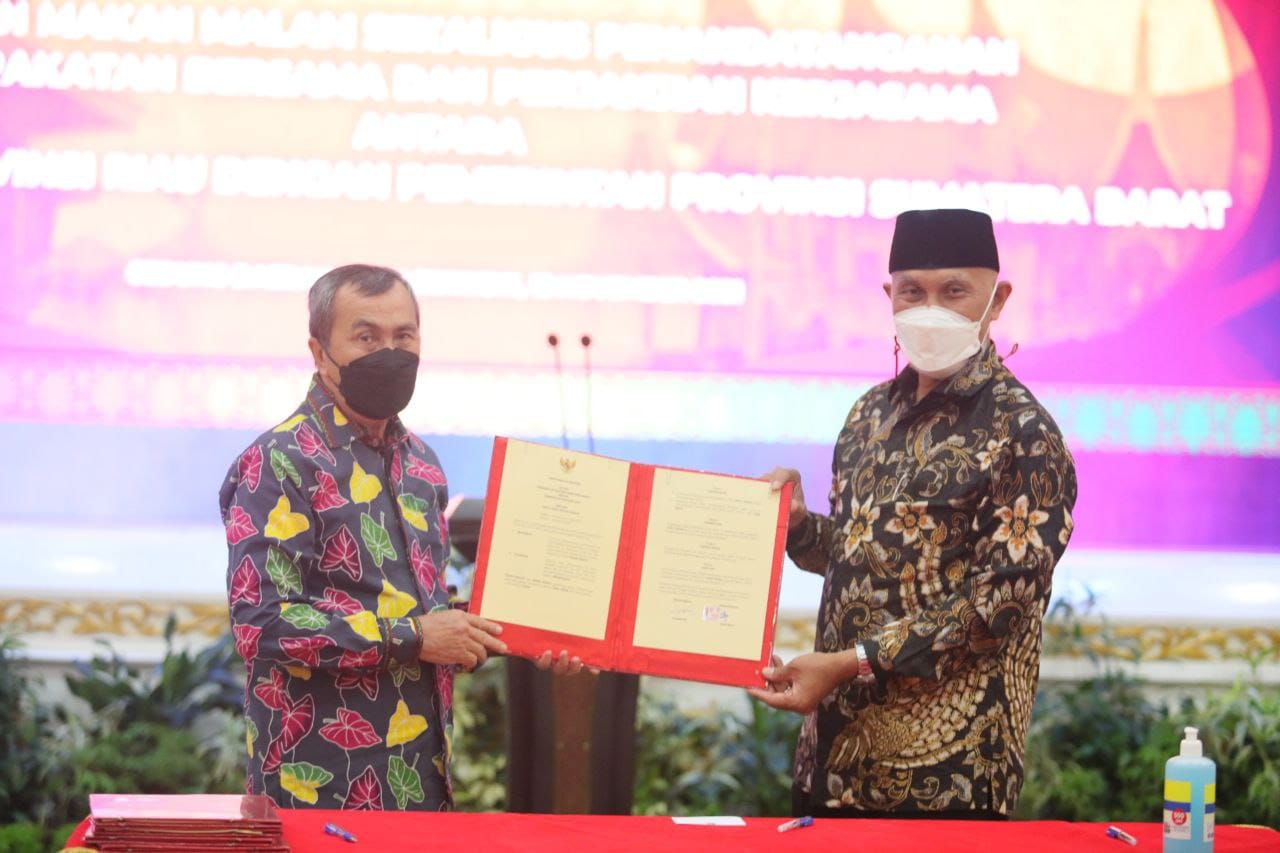 Pekanbaru,BeritaSumbar.com,- Dalam kerangka optimalisasi pembangunan daerah demi kesejahteraan masyarakat sekaligus mendukung pembangunan nasional, Pemprov Sumbar dan Pemrov Riau menandatangani kesepakatan bersama dan perjanjian kerjasama antara kedua provinsi bertetangga ini, di Gedung Daerah Balai Serindit, Kota Pekanbaru, Jumat (12/11/2021) malam.