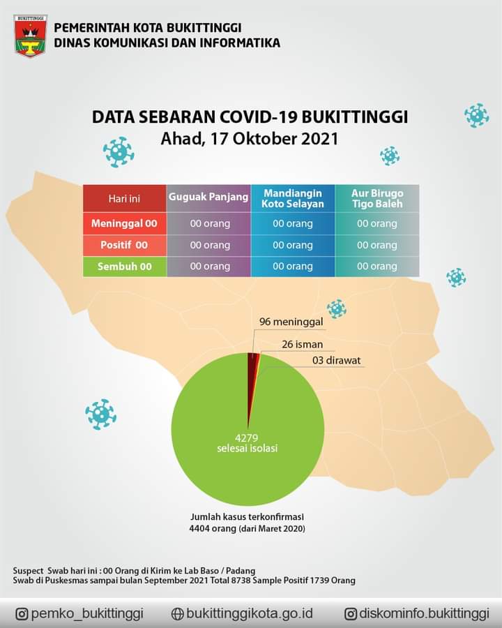 Bukittinggi, beritasumbar.com — Pandemi Covid19 di Kota Bukittinggi terus melandai. Hal ini terbukti dari data per 17 Oktober 2021, tak ada penambahan kasus terjadi di kota itu.